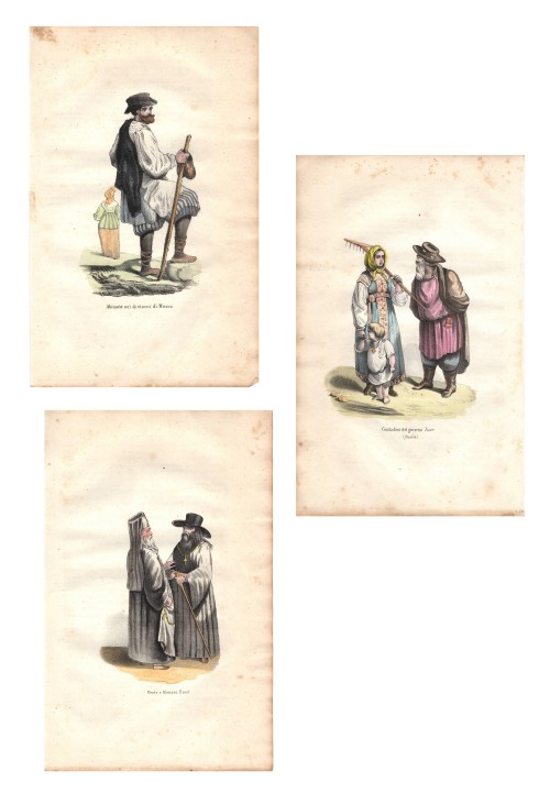 Serie di tre stampe antiche con abitanti della Russia con abiti tradizionali: un abitante dei dintorni di Mosca, contadini della regione di Tver, un prete e un monaco della Chiesa Ortodossa Russa.