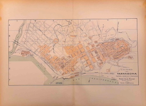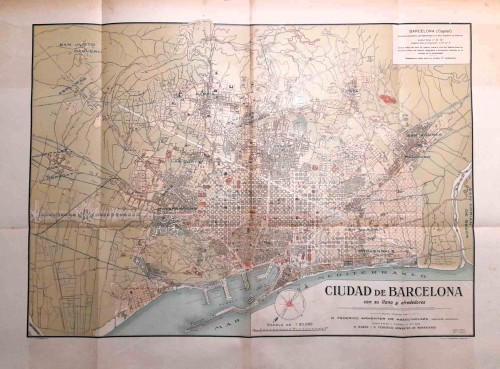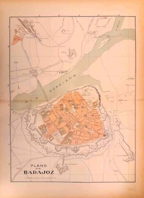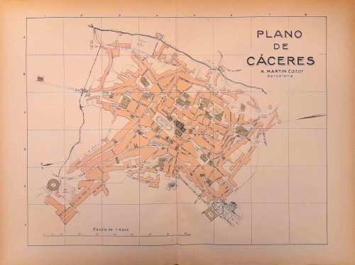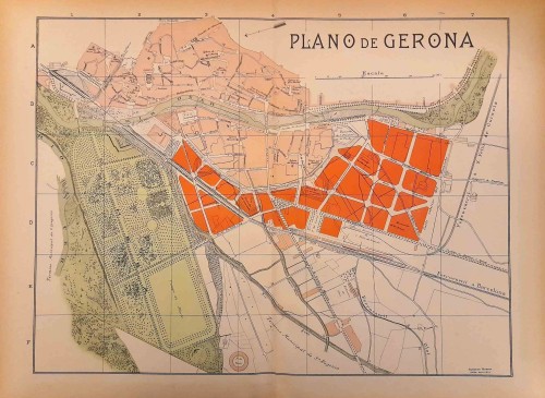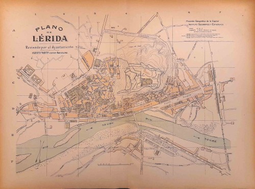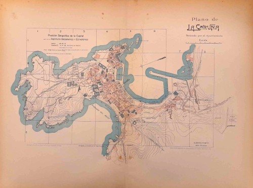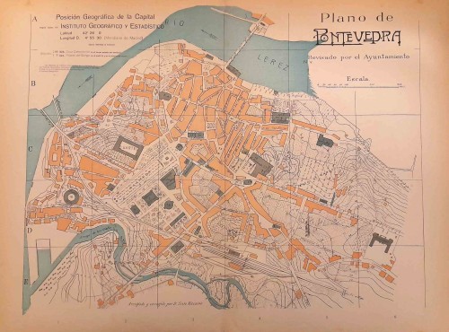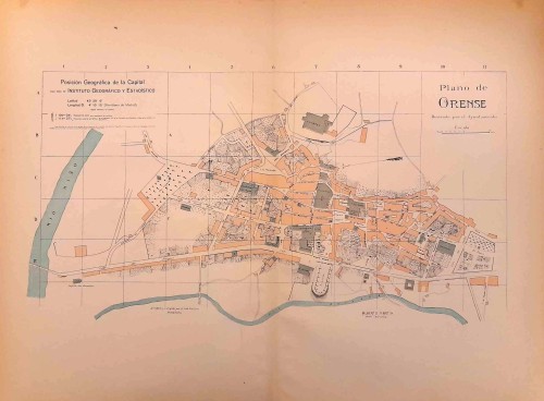 Carta geografica antica di grande formato con pianta di Orense (Ourense), città della Galizia (Galicia) in Spagna. |