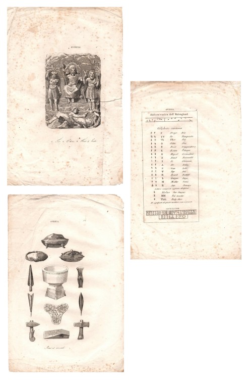 Serie di 3 stampe antiche dedicate alla storia e cultura della Svezia, un bassorilievo con quattro divinità nordiche, Thor, Odino, Freyr e Lochi, un Alfabeto Runico dell' Halsingland, armi ed utensili delle antiche popolazioni. |