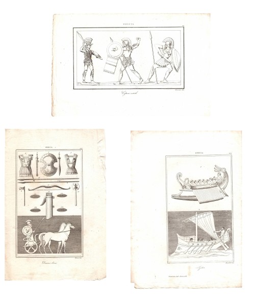 Serie di 3 stampe antiche con ritratti di filosofi, scrittori, oratori, politici e militari della Grecia classica: Eschine, Demostene, Lisia, Isocrate, Licurgo, Solone, Milziade, Temistocle, Diogene e Alessandro Magno.