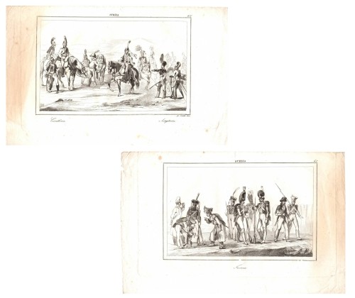 Coppia di stampe antiche con soggetti dell' Inghilterra all'epoca dei Tudor: alcuni militari con armi e armature e una veduta a volo d'uccello della Torre di Londra.