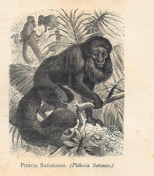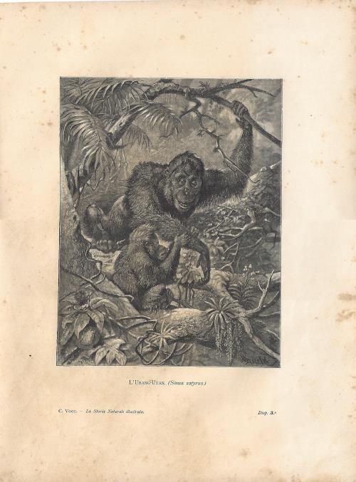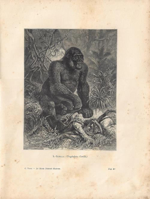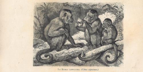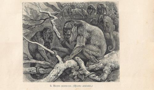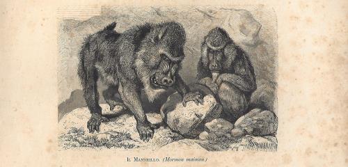 Stampa antica con numerosi esemplari di scimmia babbuino giallo (oggi Papio cynocephalus). |