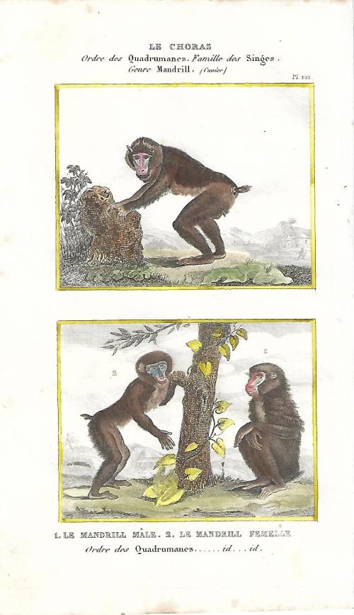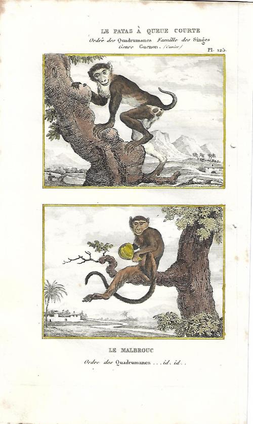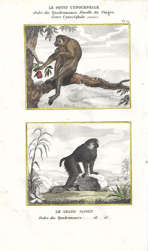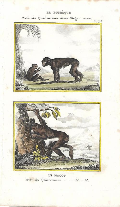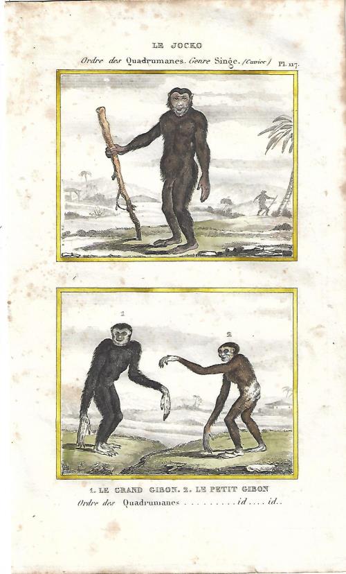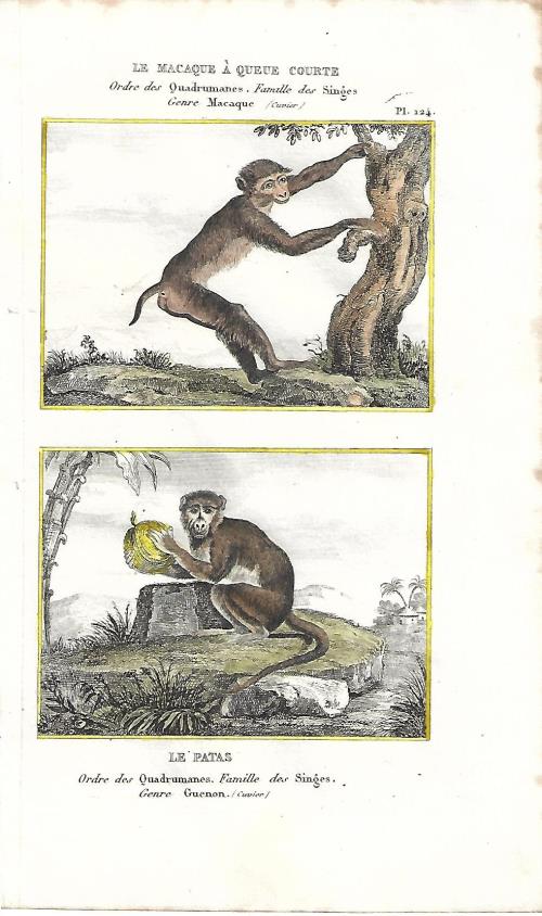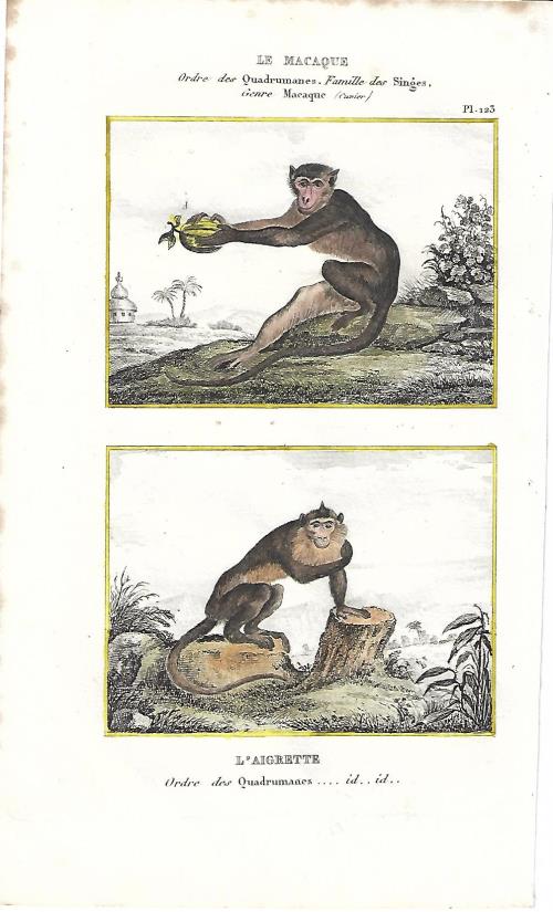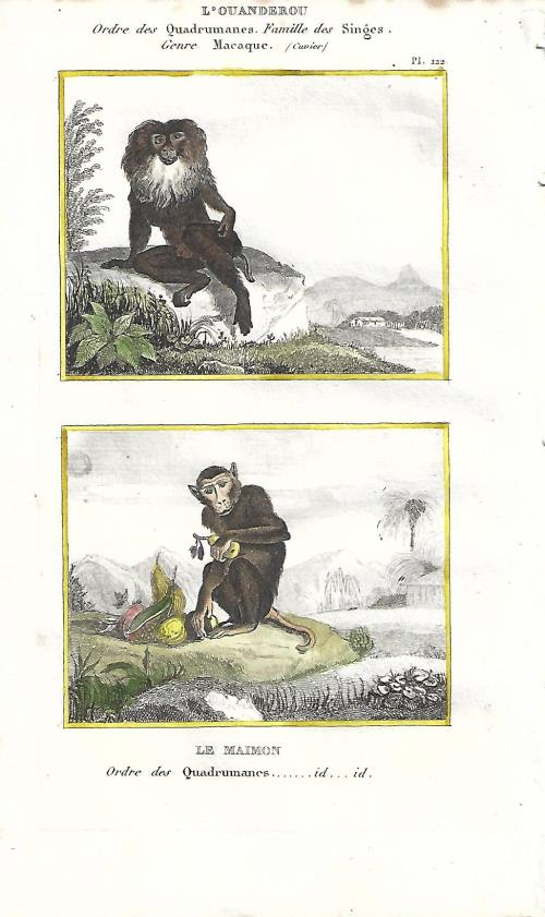 Stampa antica con due incisioni con scimmie, il sileno o macaco dalla barba bianca (Macaca silenus) e il macaco nemestrino (Macaca nemestrina). |