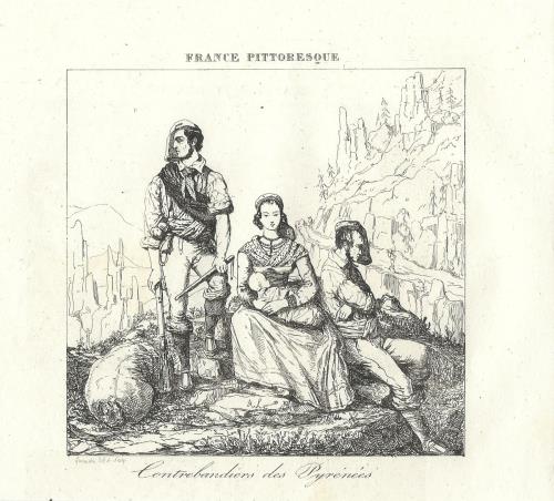 Stampa antica con una famiglia di contrabbandieri dei Pirenei, due uomini e una giovane donna con un bimbo lattante in braccio. |