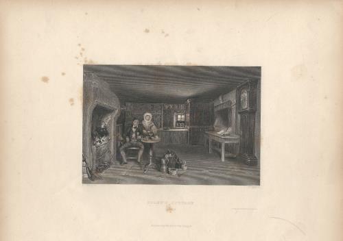 Stampa antica con scorcio dell'interno dell'abitazione di Robert Burns (Alloway, 25 gennaio 1759 – Dumfries, 21 luglio 1796), poeta e compositore scozzese, il più noto fra quanti scrissero versi in lingua scots. Il letterato è seduto davanti al camino acceso assieme alla moglie. |