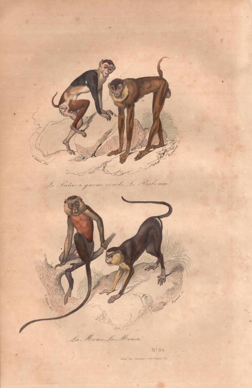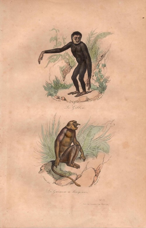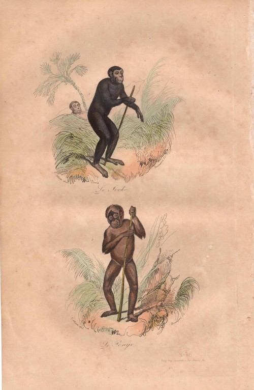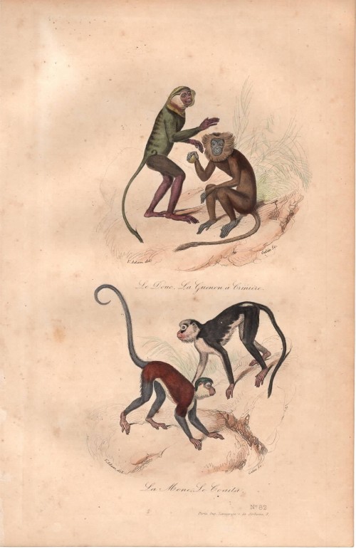 Stampa antica con incisioni con scimmie langur duca, scimpanzè dalla criniera, cercopiteco mona, atele. |