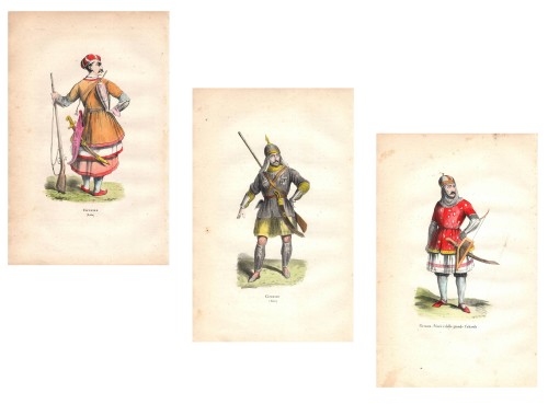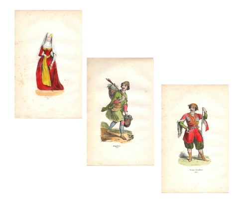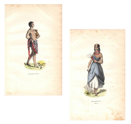 Coppia di stampe antiche con il vecchio mondo, Europa, Asia e Africa, e il nuovo mondo, le Americhe. Le stampe sono state pubblicate nel 1853 ma i disegni risalgono al 1749, come indicato sui fogli, e sono opera del celebre cartografo Robert de Vaugondy figlio. A quell'epoca il continente australiano è ancora sconosciuto. |